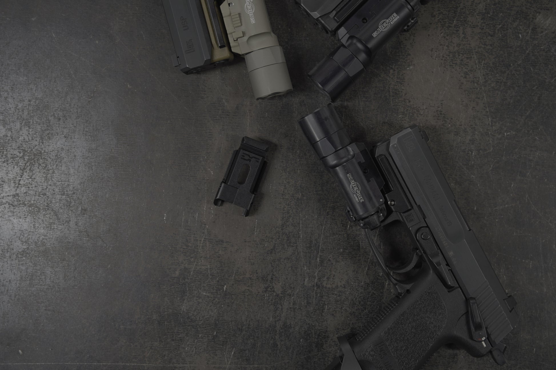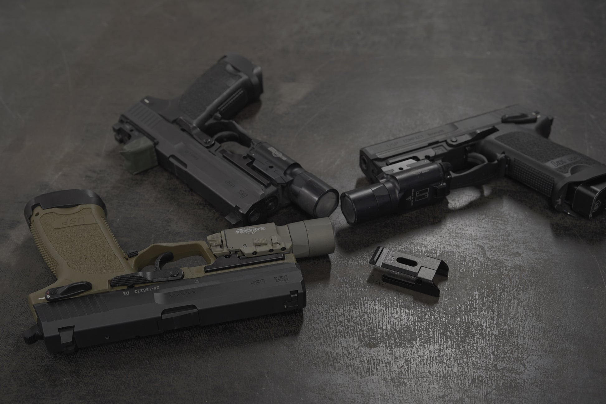 Due to variances in polymer frames this bracket may require hand fitting by a certified gunsmith to work on certain HK compact frames in .45ACP calibers. To fit an X300-A model the 1913 picatinny slot bar will need to be installed, and material will need to removed from the back side of the switch where it meets the trigger guard or the light cannot seat and lock into place. The X300-A model will always have some play in the lock up as it has much looser tolerances than the thumbscrew B model does. A gunsmith certified in HK is recommended to hand fit certain lights and caliber options. The bracket itself can be hand-filed at the screw mating surfaces to remove a few thousandths of an inch off the flats to allow the adapter to tighten up on certain .45 ACP frames.