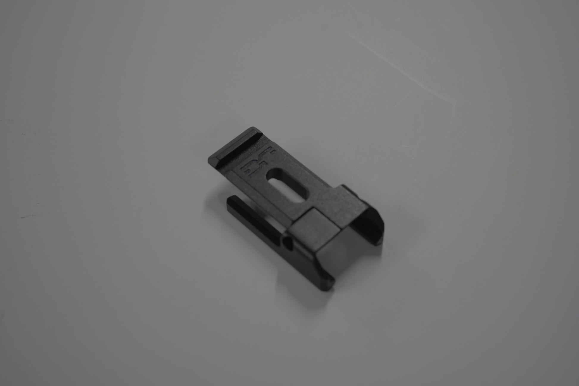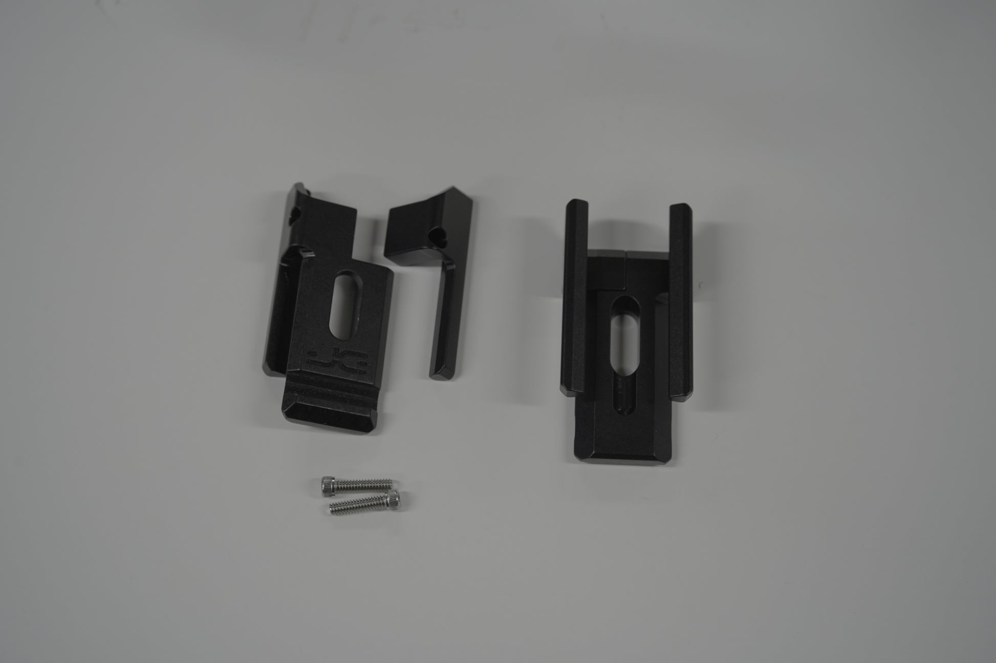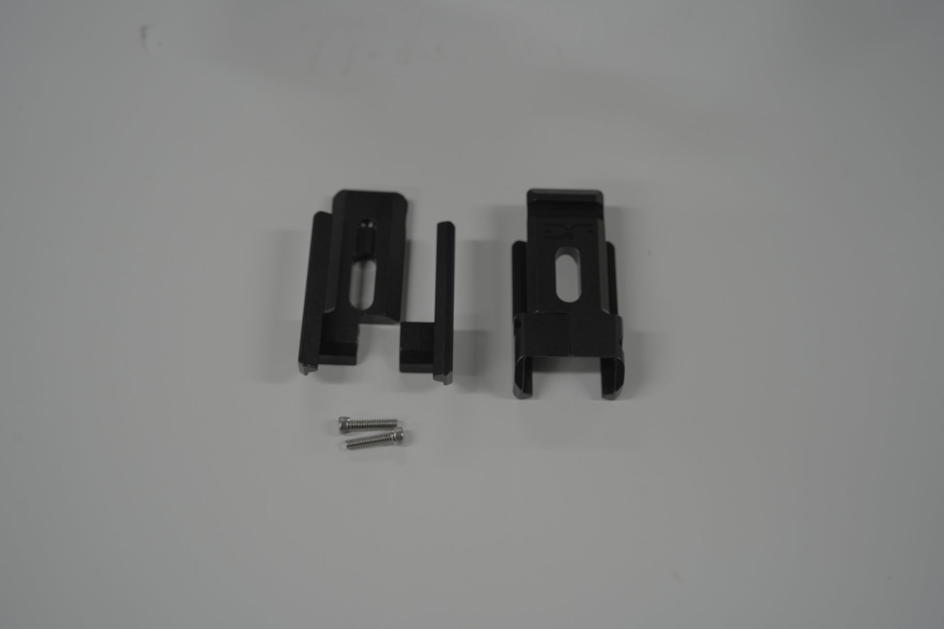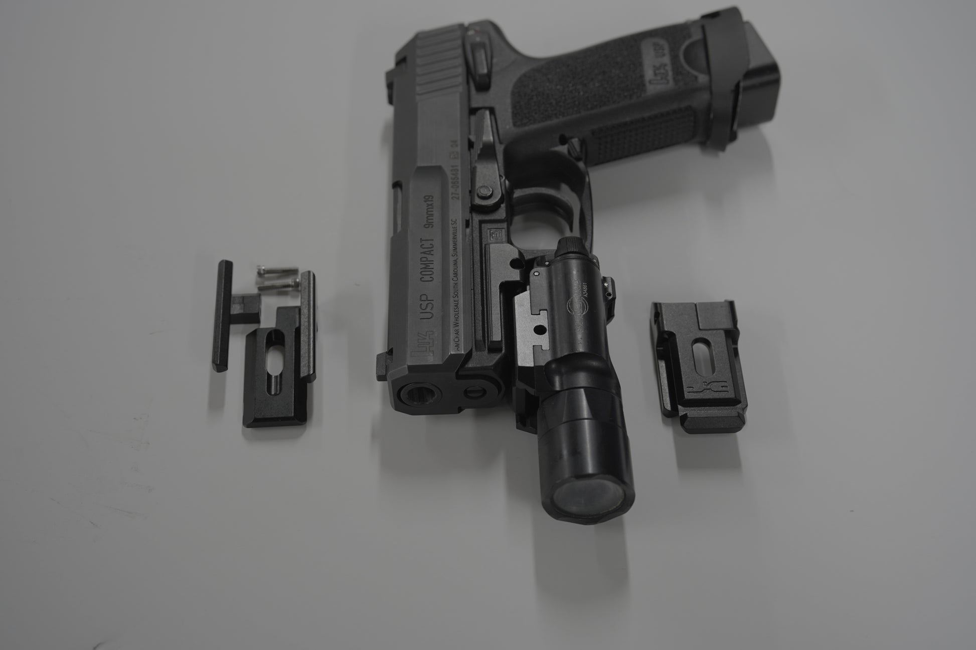 This is a reproduction clone of Surefire's MR08 flashlight adapter for Heckler & Koch USP compact handguns. This will allow the use of the X300 B model thumbscrew attachment variant (X300U-B, X300V-B, X300T-B) to be adapted to the HK proprietary non 1913 accessory rail found on all USP compact pistols. The adapter is a 2pc design made from 7075 aluminum with a type 3 hardcoat anodizing in black. Hardware is stainless steel socket head cap screws with a thread pitch of 18-8 and a diameter and length of 4/40 x1/2". Recommended torque spec on the bracket is 15 in-lbs. Having a 2pc design allows the X300Ub to sit closer to the trigger guard than a GG&G 3pc 6061 adapter does, and will not sag or flex allowing use of IR laser aiming modules. The MR08 reproduction bracket will fit Heckler and Koch USP compact pistols in all calibers; it will not work on any USP full size frame however.